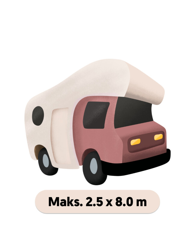 - Din vogn må maks. være 2.50 meter bred og 8.0 meter lang. Det er nogle mål, der er sat på baggrund af brandsikkerhed. Fordi; det ér bare bedre at sove trygt. Vi forbeholder os retten til, at afvise vogne der ikke overholder målene.