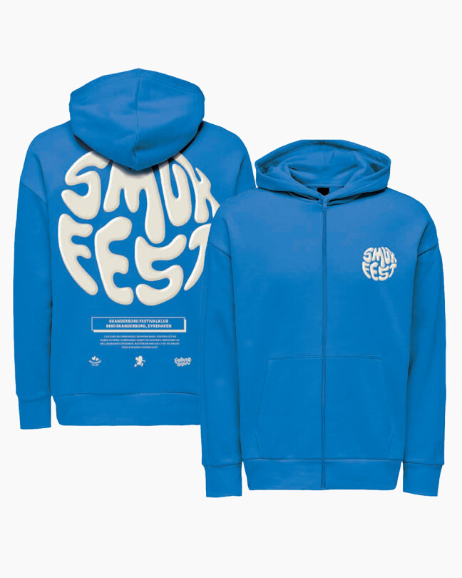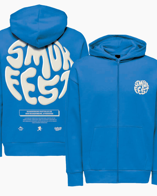 Gør dig klar til festival og fællesskab med denne karakteristiske SMUKFEST hoodie i strålende blå.