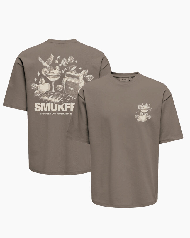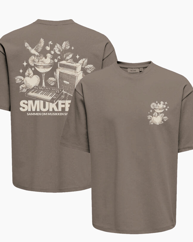 En hyldest til musikken, naturen og fællesskabet! Denne unikke SMUKFEST T-shirt forener det poetiske med det festlige. Med detaljeret frontprint og et kunstnerisk rygmotiv med cocktailglas, højtaler, keyboard og fugle i harmoni, er den et ægte blikfang.