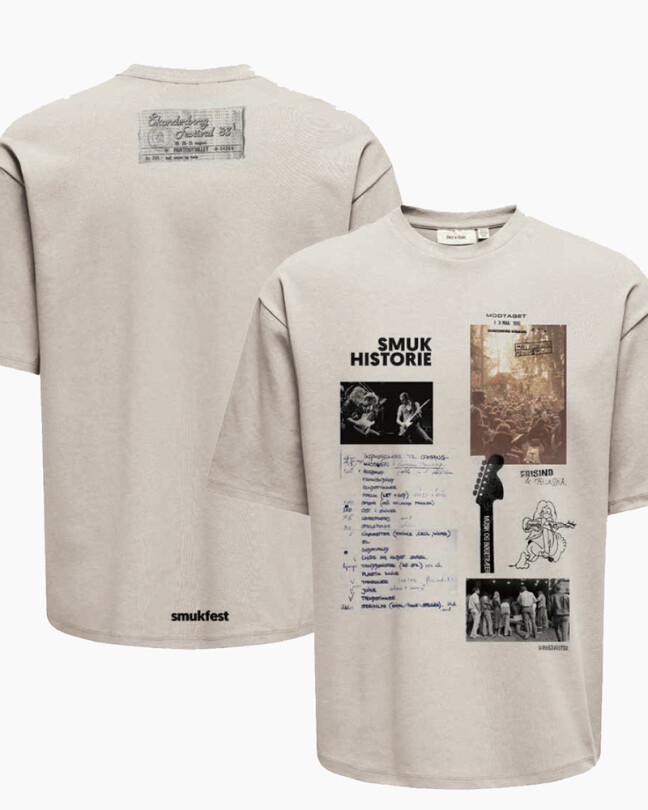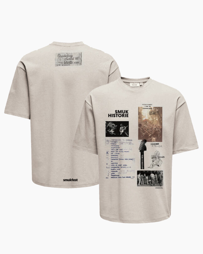 Denne t-shirt fortæller historien om Smukfest gennem ikoniske billeder, håndskrevne lister og stemningsfulde øjeblikke. I nakken er påsyet et print af partoutbilletten ra 1983 - En collage af minder, musik og mennesker – trykt på blød bomuld i en klassisk sandfarve.